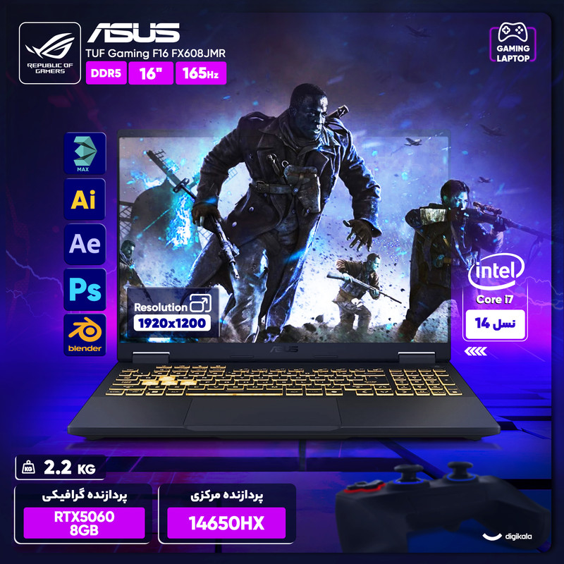 لپتاپ ASUS TUF Gaming F16 FX608JMR با ترکیب سختافزاری قدرتمند و طراحی مستحکم، یکی از کاملترین گزینهها در رده گیمینگ محسوب میشود. این دستگاه با وزن ۲.۲ کیلوگرم و ابعاد ۲۷.۳ × ۲۶۹ × ۳۵۴ میلیمتر طراحی شده و بهلطف شاسی بهینهشده سری TUF، مقاومت بالا و عملکرد پایدار را همزمان ارائه میدهد. قلب سختافزاری دستگاه پردازنده شانزده هستهای Intel Core i7‑14650HX از نسل چهاردهم است که با فرکانس ۱.۶ تا ۵.۲ گیگاهرتز و حافظه کش 30 مگابایت، قدرت کافی برای اجرای بازیها، پردازشهای سنگین و کارهای تولید محتوا فراهم میکند. در کنار این پردازنده قدرتمند، کارت گرافیک NVIDIA GeForce RTX 5060 با هشت گیگابایت حافظه اختصاصی و توان 100 وات (تا 115 وات در حالت افزایشی) اجراهای روان و نرخ فریم بالا در بازیهای روز را تضمین میکند. وجود 32 گیگابایت حافظه رم DDR5 با فرکانس 5600 مگاهرتز امکان اجرای همزمان چندین برنامه و بازی را بدون افت سرعت فراهم میسازد. حافظه داخلی یک ترابایت SSD از نوع PCIe 4.0 NVMe فضای کافی و سرعت بارگذاری بالا ارائه میدهد و وجود دو اسلات M.2 قابلیت ارتقا را برای کاربر آسان میکند. در بخش نمایشگر، پنل شانزده اینچی IPS Level با رزولوشن ۱۲۰۰×۱۹۲۰ و نرخ نوسازی 165 هرتز تصویری روان، دقیق و مناسب بازی ارائه میدهد و پوشش 100 درصدی فضای رنگی sRGB برای کارهای گرافیکی نیمهحرفهای نیز مناسب است. پشتیبانی از G‑Sync، MUX Switch و فناوری NVIDIA Advanced Optimus کیفیت تصویر و عملکرد گرافیکی را به سطح بالاتری میبرد. باتری چهارسلولی 90 واتساعتی شارژدهی بسیار خوبی برای این کلاس سختافزاری فراهم میکند. وجود پورتهای کامل شامل USB‑C، Thunderbolt چهار، HDMI 2.1، LAN و Wi‑Fi 6E قابلیت اتصال گستردهای ارائه میدهد. کیبورد با نورپردازی تکناحیه RGB، وبکم ۱۰۸۰p و اسپیکرهای مجهز به Dolby Atmos تجربهای کامل برای کاربری گیمینگ فراهم میکنند.
